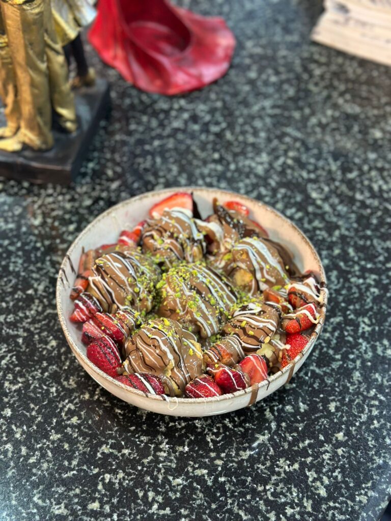 profiterol çilek ve belçika çikolatasıyla servis edilir